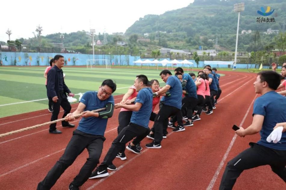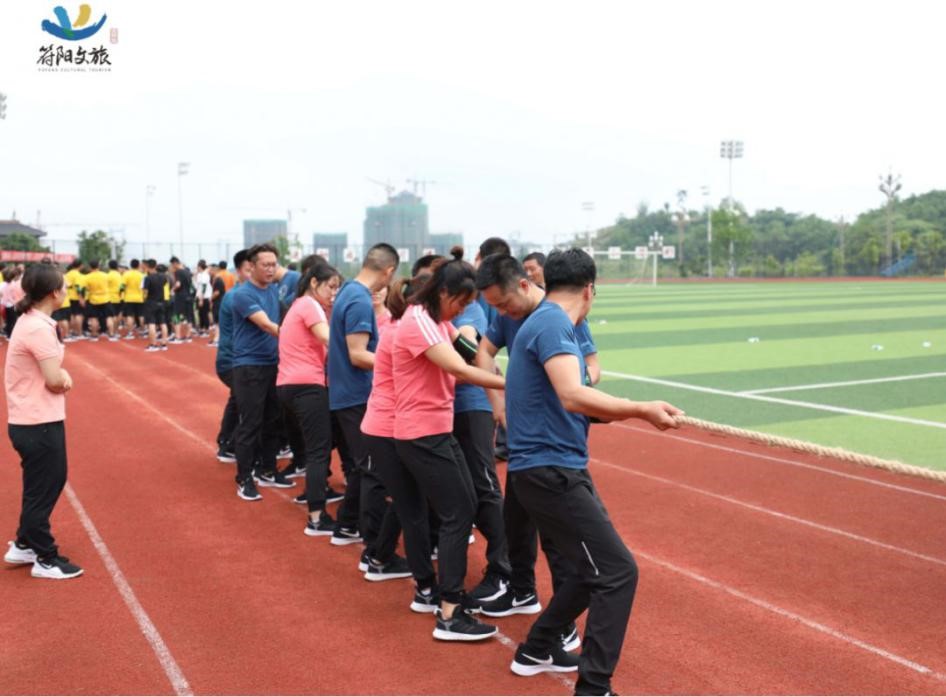 隨著哨聲一響,我們雙手握緊長(zhǎng)繩,咬緊牙關(guān)向后拉,為了把握節(jié)奏形成合力,心里默念著“一二、一二”,場(chǎng)上一時(shí)僵持難下,但難敵強(qiáng)悍對(duì)手,第一局廣源達(dá)勝。這仿佛符合多數(shù)人的預(yù)期,但我們?cè)鯐?huì)被拘于這固定印象,越戰(zhàn)越勇才是符陽文旅人的風(fēng)姿。第二場(chǎng)對(duì)決比第一場(chǎng)更加艱難,一開場(chǎng)廣源達(dá)占據(jù)絕對(duì)優(yōu)勢(shì),我們險(xiǎn)被拉到了終線,全憑一口氣死撐,牙關(guān)咬緊,身體后傾,不斷降低重心,腳步穩(wěn)扎,做著別人眼里無畏的掙扎。一定不能越線!在超高壓下堅(jiān)持了十余秒,那一刻拼的就是韌勁!一群瘦弱的文旅人憑著一股拼勁慢慢把賽場(chǎng)主動(dòng)權(quán)掌握在了自己手中,每向后移動(dòng)一步,心里的勁更足了,如荒漠迷路的旅者遇見了綠洲,我們也尋得了力量之源。當(dāng)現(xiàn)場(chǎng)歡呼聲響起時(shí),我們已癱坐一片,不敢置信,我們贏啦!