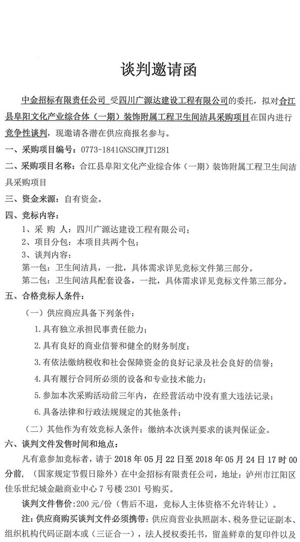 談判邀請函(合江縣阜陽文化產(chǎn)業(yè)綜合體(一期)裝飾附屬工程衛(wèi)生間潔具采購項(xiàng)目).doc